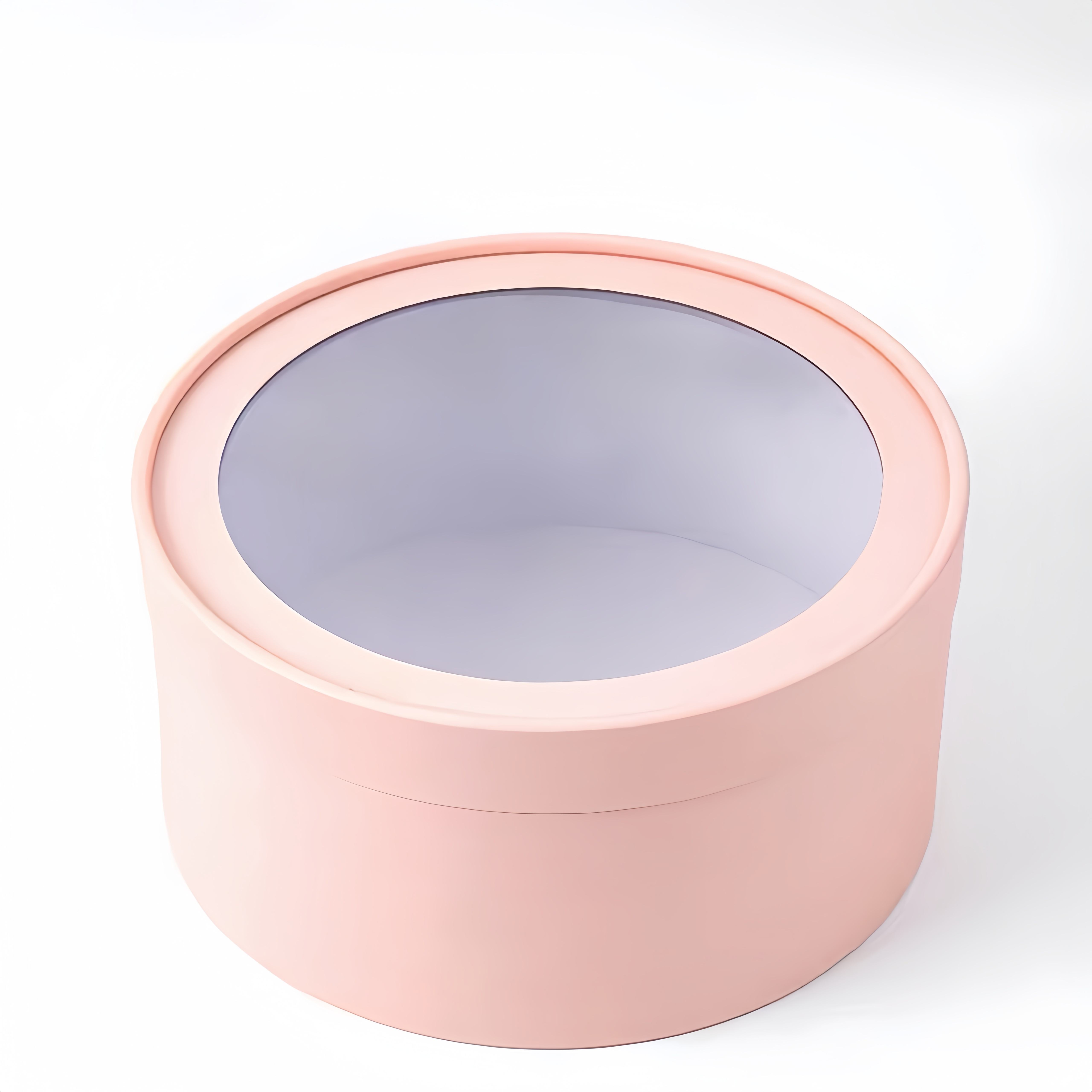 Round cylindrical gift box constructed from rigid paperboard with a smooth matte exterior surface. The fitted lid includes a circular clear plastic window that allows visibility of contents without opening.